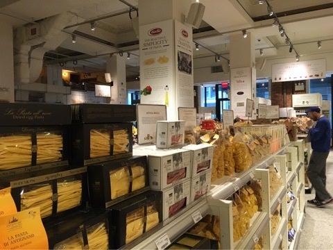 様々な種類のパスタや調味料、ワインなど