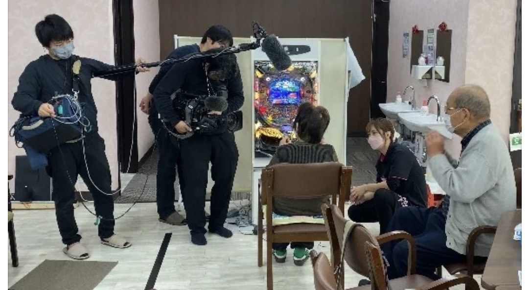 NHK前橋「ほっとぐんま630」の取材の様子(福祉施設における機能訓練用パチンコの活用)