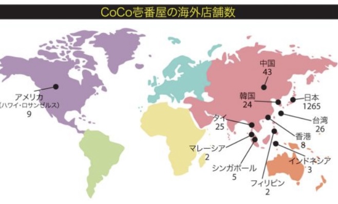 CoCo壱の海外店舗数のマップ
